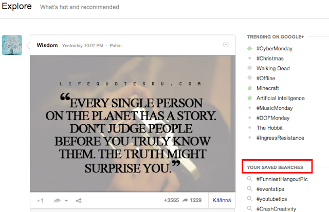 The Explore stream portrays popular posts from users. On this tab you can also find your Google+ saved searches.